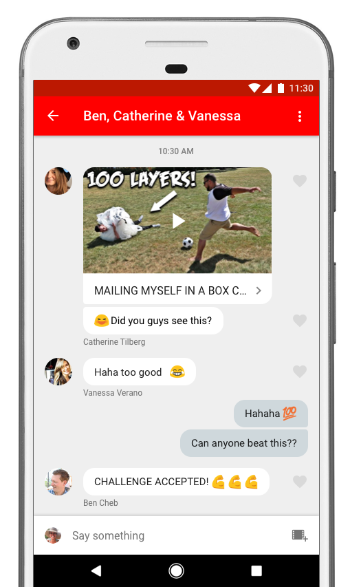 Mulai hari ini, Anda dapat berbagi video dengan teman dan keluarga Anda secara langsung di YouTube. Anda tidak hanya dapat berbagi dan menerima video di aplikasi ini, Anda juga dapat mengobrol tentang hal itu di YouTube, membalas dengan video lain, mengundang orang lain ke percakapan, dan banyak lagi. Kami pikir ini akan mempermudah berbagi, lebih cepat, dan lebih menyenangkan di telepon Anda. Dan jika Anda ingin terus berbagi video melalui aplikasi lain, Anda tetap dapat melakukannya juga.